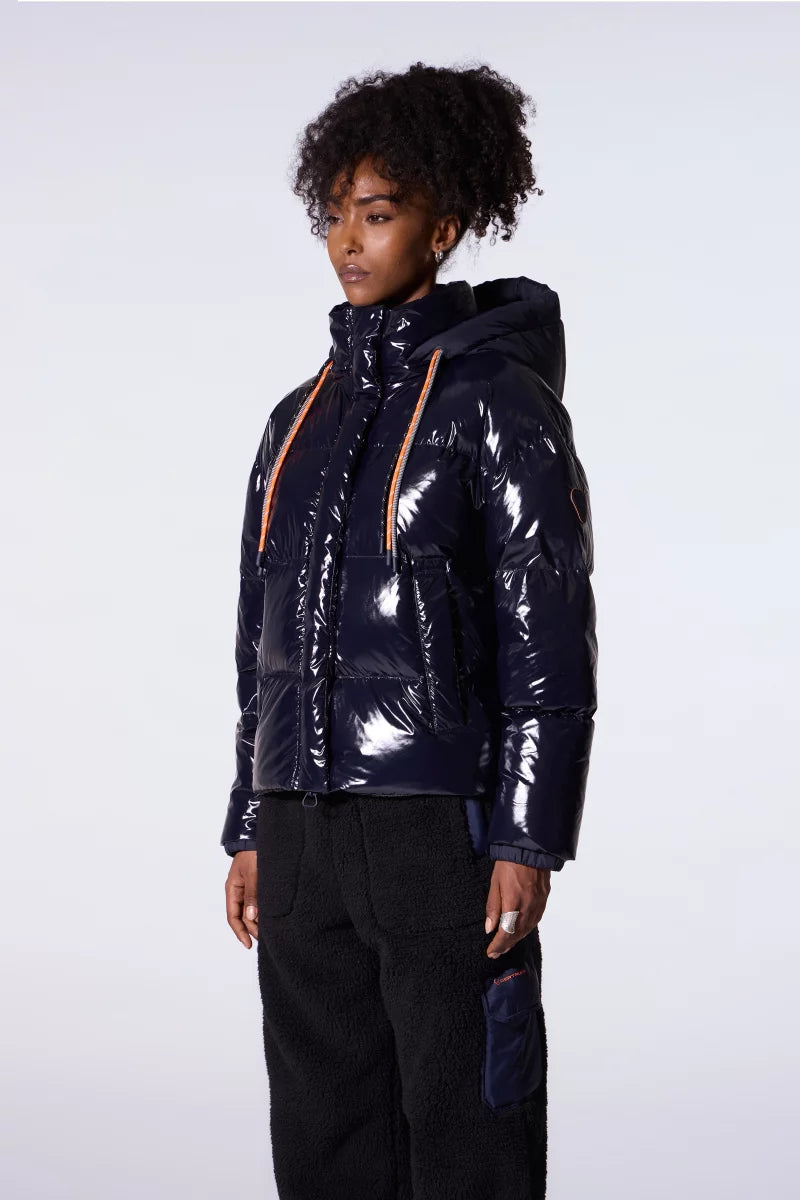 LILI BRIGHT est une doudoune courte confectionnée en nylon glossy. La capuche est amovible et ajustable grâce un triple cordon. Les manches tombantes sont élastiquées au poignet. L’ouverture zippée sur le milieu devant est cachée par une patte pressionnée. Le zip en plastique injecté est rehaussé d’une tirette contrastée. Deux poches sont insérées sur le devant. Le patch en silicone ton sur ton iconique de la marque est apposé sur l’épaule.