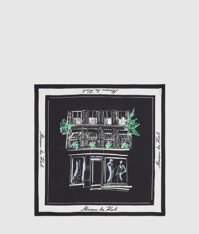 Une écharpe carrée en soie ornée de l'illustration Maison de Karl et d'une bordure avec logo contrastante, alliant un esprit artistique à un style raffiné dans un accessoire polyvalent.