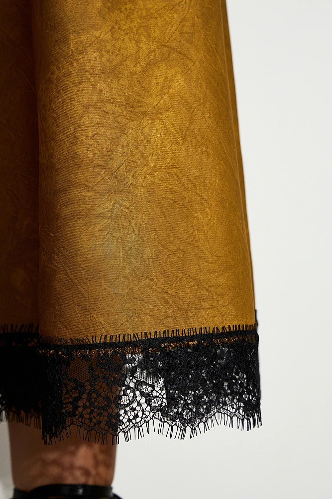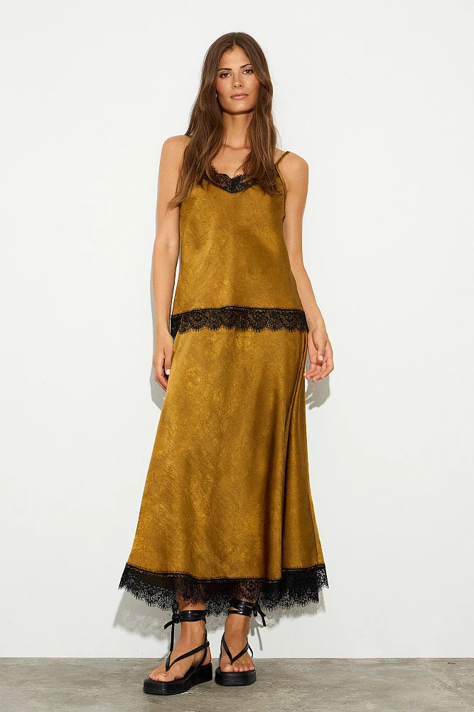Jupe longue, taille élastiquée, avec dentelle sur le bas, texture satinée, coupe régulière