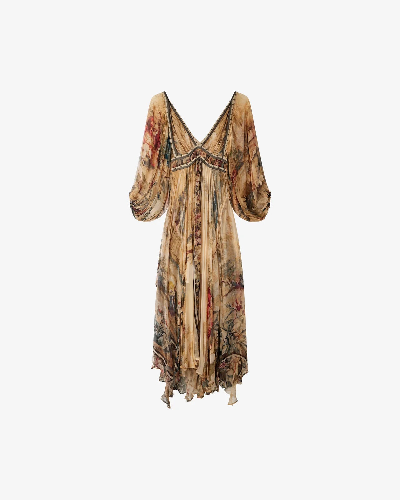 Un esprit bohème magnifié par la richesse des détails. Cette robe longue en viscose chiffon dévoile un imprimé baroque sur fond écru, comme un tableau en mouvement. Sa coupe ample, souple et asymétrique offre une allure à la fois libre et affirmée. Des clous délicatement posés viennent ponctuer l’encolure, le buste et le dessous de poitrine, dessinant la silhouette avec éclat. Les manches larges, transparentes, resserrées par un élastique au poignet, laissent subtilement entrevoir le bras à travers une ouverture discrète. À l’arrière, deux pans volantés apportent un jeu de volume poétique et inattendu. Entièrement doublée pour plus de confort, cette robe révèle un équilibre parfait entre romantisme, sophistication et audace.